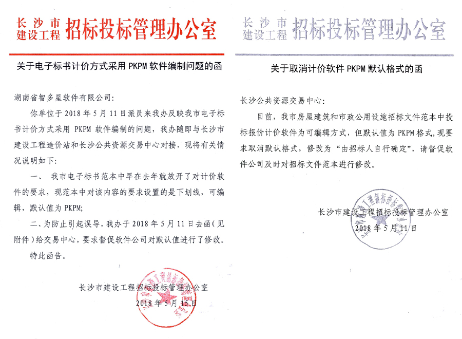 這種有悖公平、公正市場原則的做法,既損害了其他造價軟件公司的利益,更迫使建設工程造價從業(yè)單位增購PKPM軟件,大幅增加了建設工程造價從業(yè)單位的負擔,社會影響十分惡劣。湖南智多星軟件有限公司作為湖南省工程造價軟件唯一一家新三板掛牌企業(yè),我們有責任替廣大造價軟件用戶和企業(yè)說話,因而我們毅然決然對這種不公平的現(xiàn)象說“不”!在2018年5月,我公司通過信函、上門的方式,積極向紀檢及相關職能部門進行投訴反饋,通過多次溝通協(xié)商,2018年5月11日,長沙市招標辦正式發(fā)函,取消在長沙市建設項目招投標過程中默認PKPM計價軟件,改為通用格式,并正式通知長沙市公共資源交易中心,要求其在標書模板上進行修改(見附件)。我公司也于2018年5月17日收到長沙市公共資源交易中心的正式通知,告知我司標書模板已修改完成。在日后的建設工程造價工作中,若再次遇到指定使用PKPM軟件的情況,歡迎向我公司反饋,我們將全力配合調(diào)查取證,并積極向上級主管部門舉報。